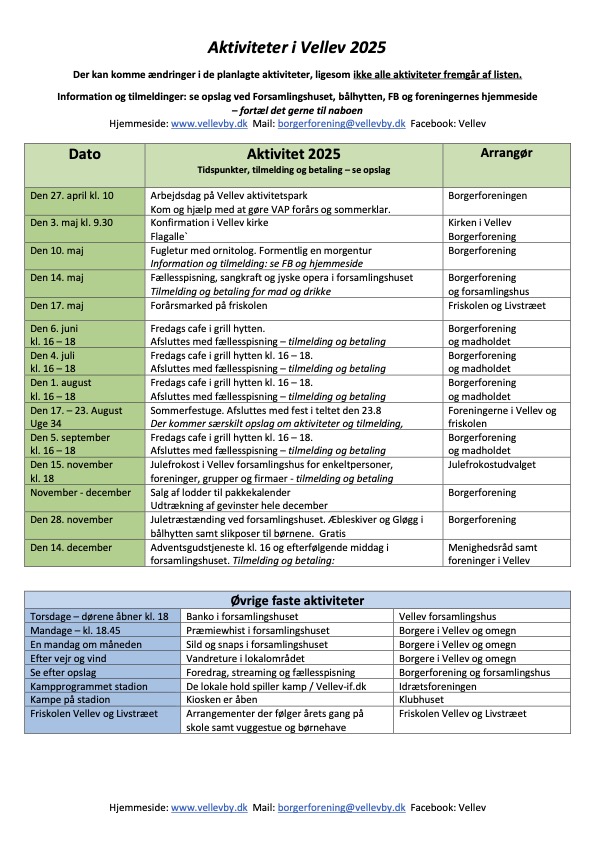 Aktivitetsblad: Aktiviteter i Vellev 2025. Aktiviteter på stadion: www.vellev-if.dk